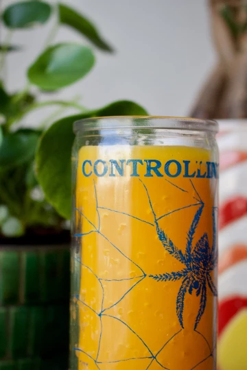 Unscented Controlling Candle with Spider and Web Graphic in yellow wax