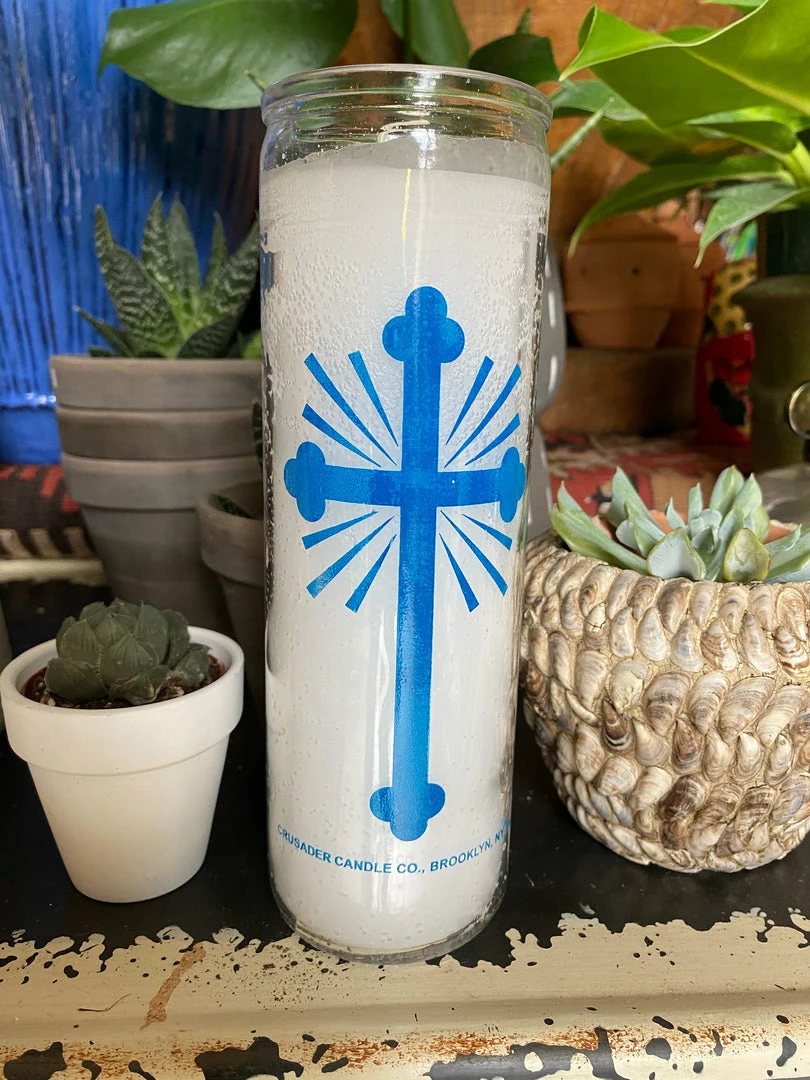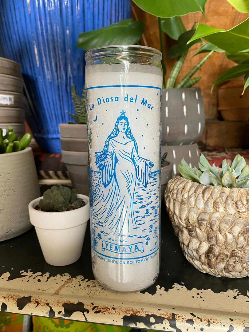 Unscented Controlling Candle with blue YEMAYA graphics poured with white wax