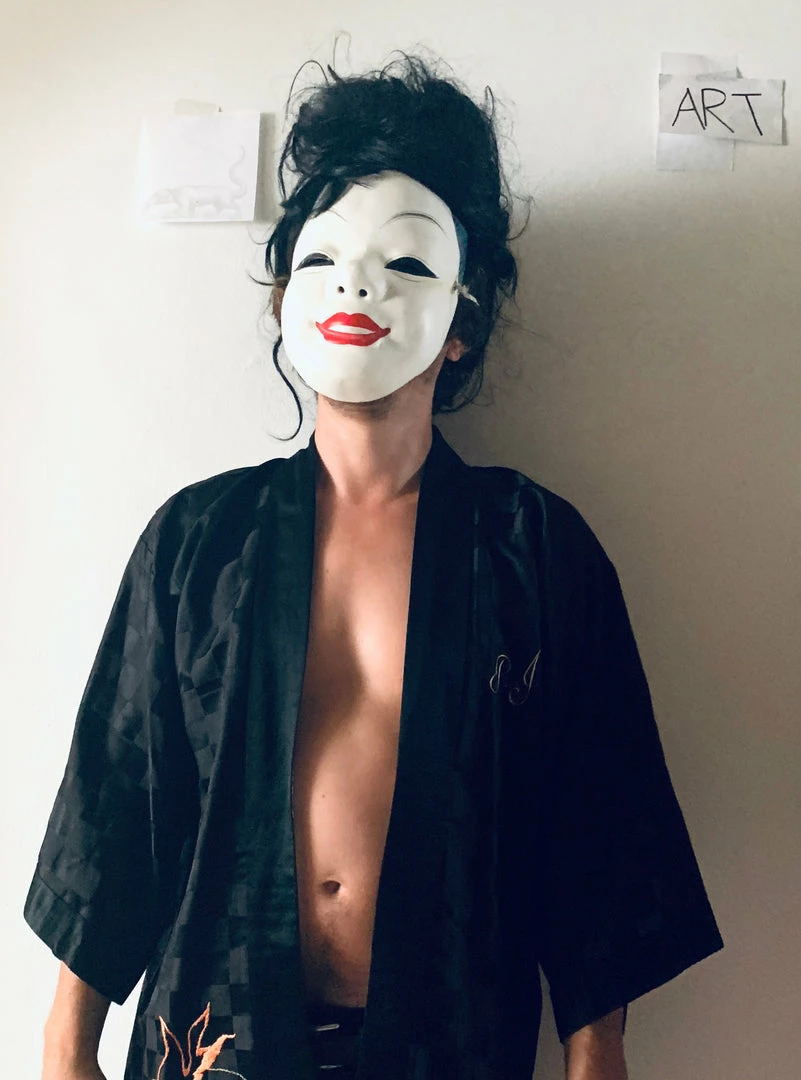 Features grey hair, red lips, black eyeliner, grey eyebrows, and a black and red bow in a pleased expression.