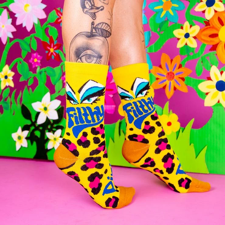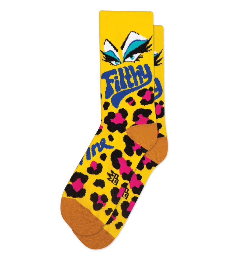 Super-comfy, unisex, one-size-fits-most, Crew Socks are made in the USA of Yellow cotton with accents of Hot Pink , Black, Turquoise, Royal Blue, White, Gold.