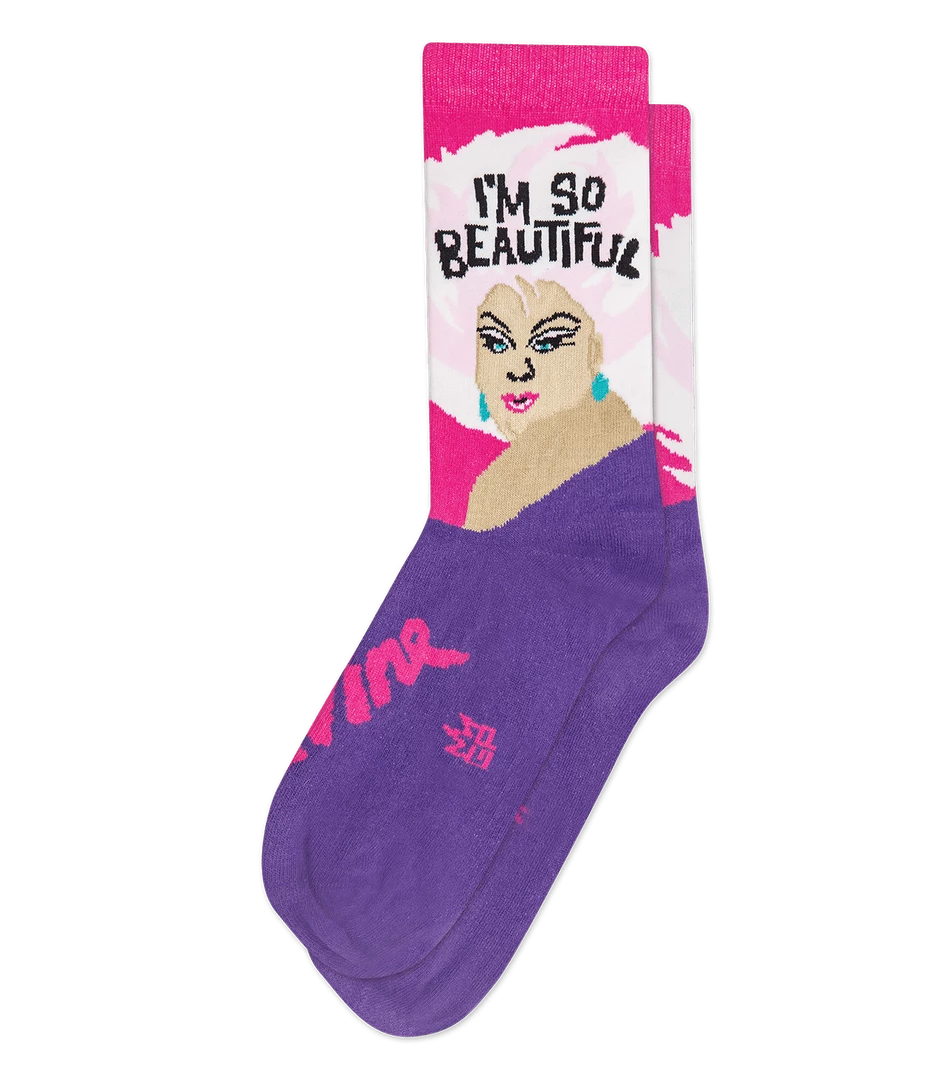Super-comfy, unisex, one-size-fits-most, Crew Socks are made in the USA of Purple cotton with accents of Pink, Oatmeal, Cream, Dark Tan, Light Tan.
