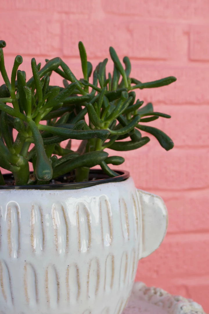 This cream colored ceramic cutie is beautifully embossed with vertical lines and milky glaze.