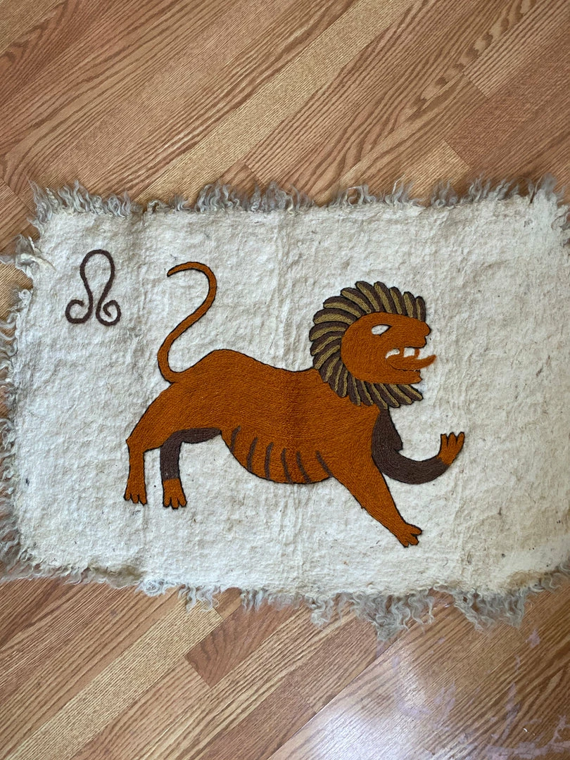 Antique Woven Wool, Embroidered Lion Layering Rug