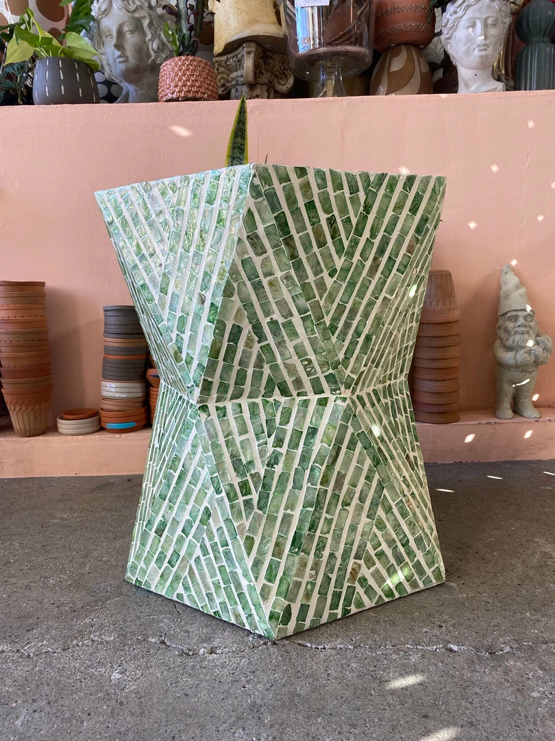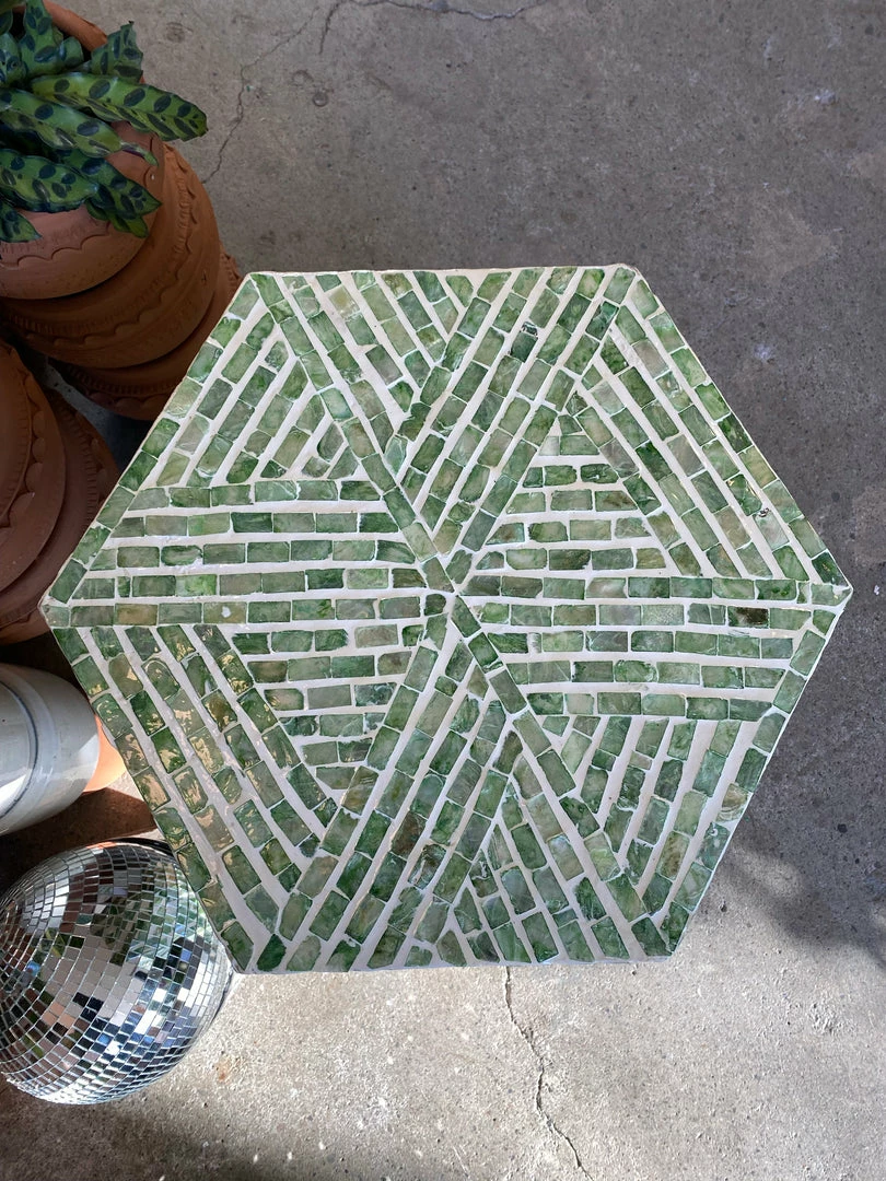 Intricate hand carved capiz gives our inlaid table soft ornate detailing