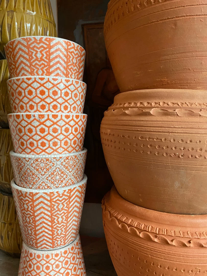 Handcrafted from terra-cotta clay with a rustic floral toile block print finish