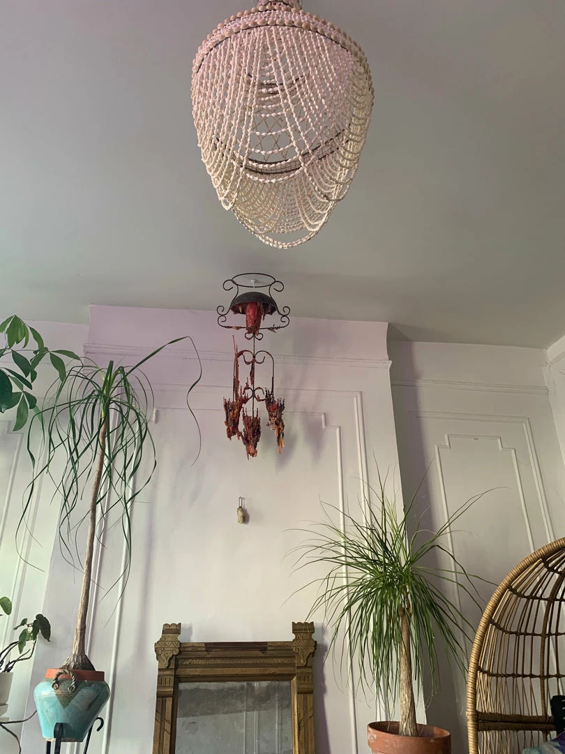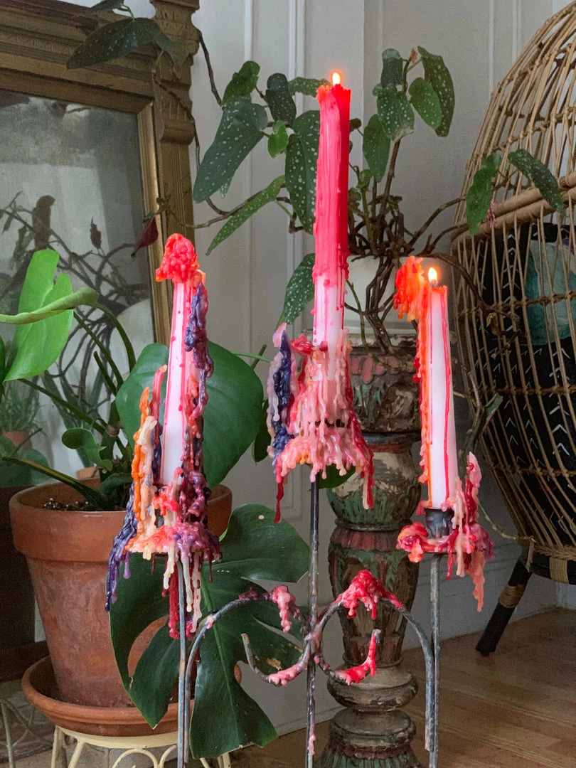 One of a kind decor piece, our rainbow drip candles on a righteous antique iron candelabra found at a priests home, fully functioning for more fun building your statement piece