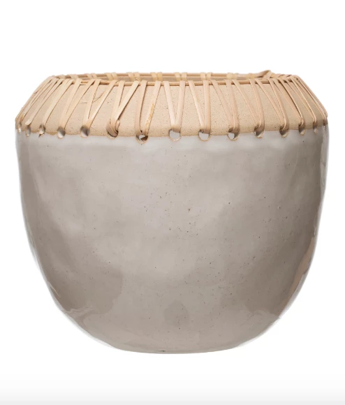 Minimalist ceramic glazed plant pot with rattan stitching on the edge