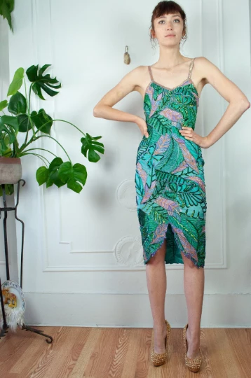 Palm Fronds in greens and purples cascade down this hourglass shaped dress