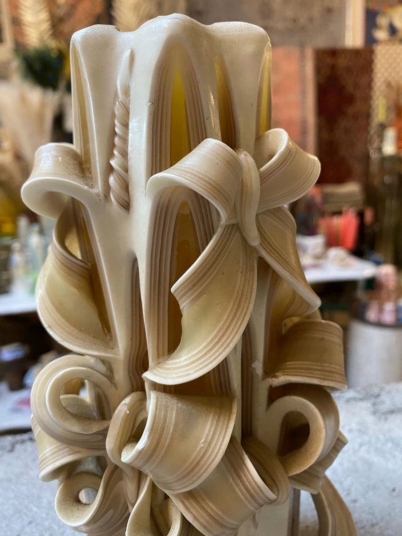 Hand carved to perfection, this unique cream colored candle makes a real statement
