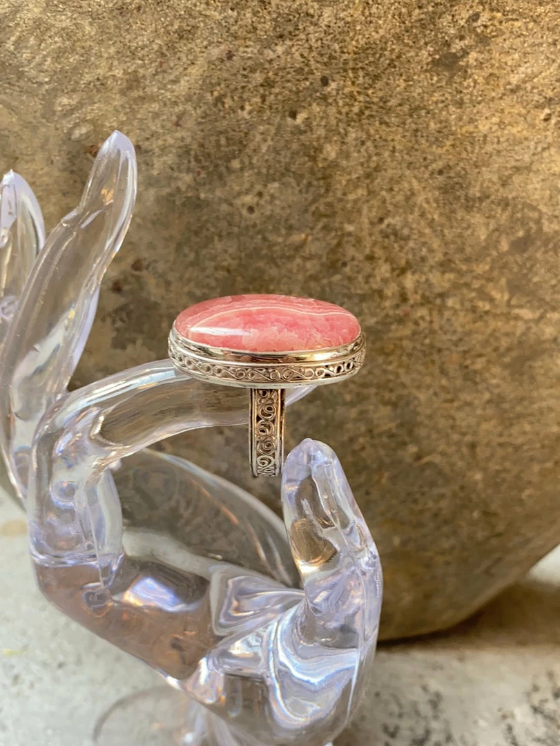 Sterling Silver band is crafted in traditional Balinese style, topped off with a dazzling Rhodonite stone