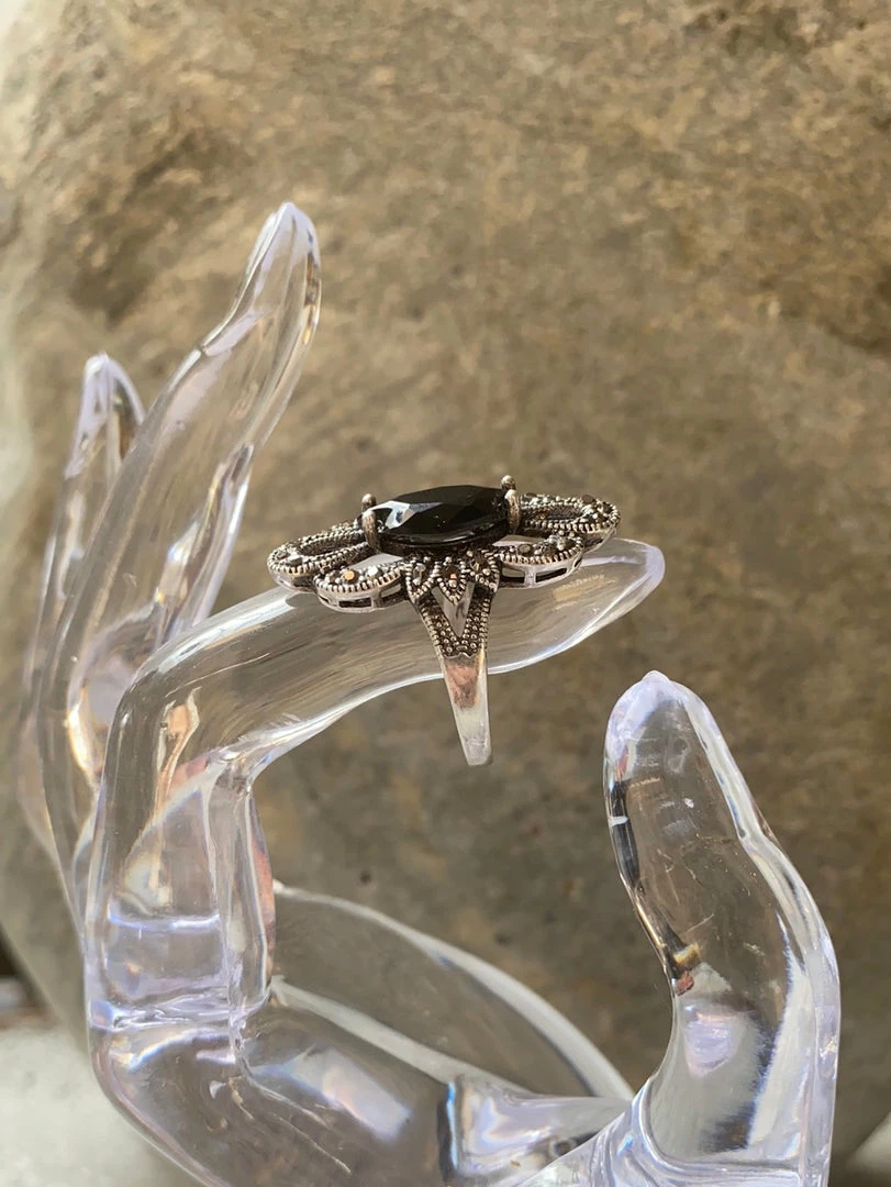 Marquise-Cut Onyx is complemented on either side by Marcasite encrusted leaf accents