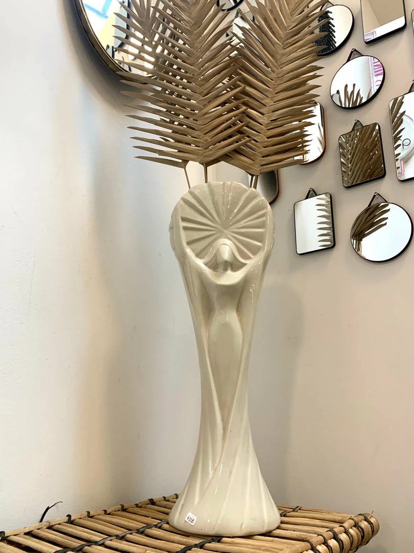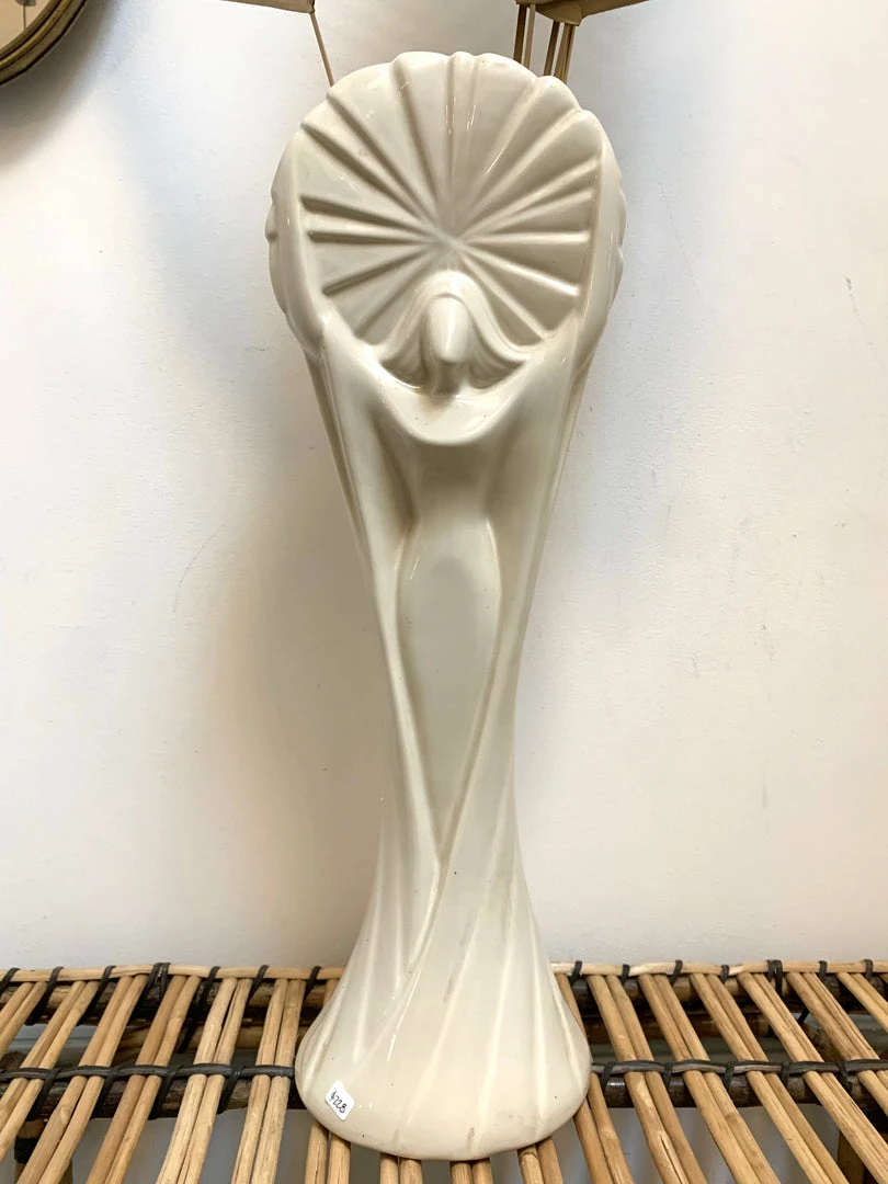 Beautiful woman figure holding up her arms in front of a sun like shape