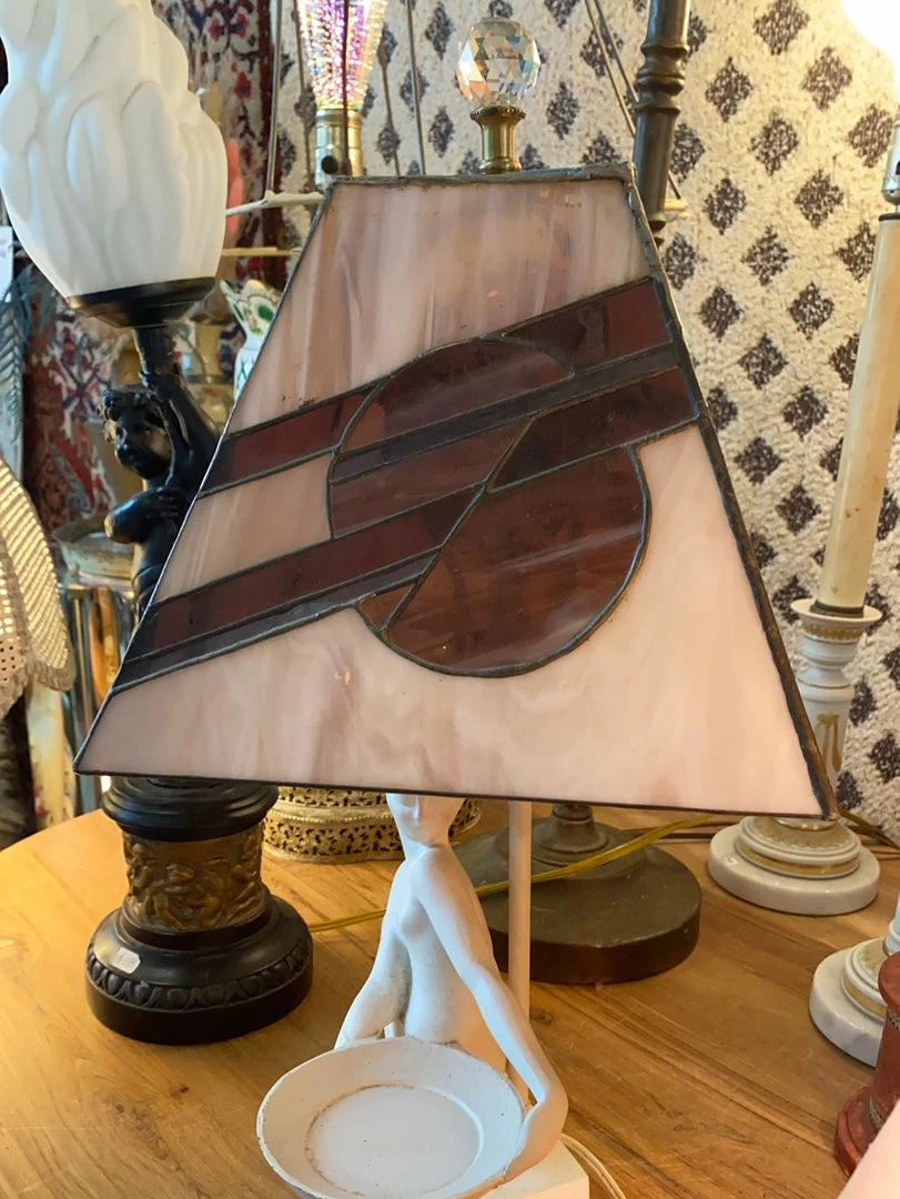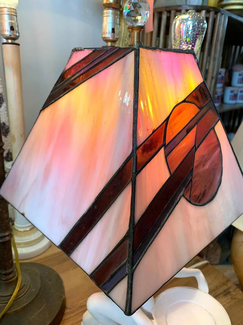 Milky four sided stained glass shade to match the beauty of the base. Two sides feature a sun like shape.