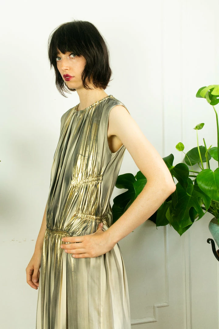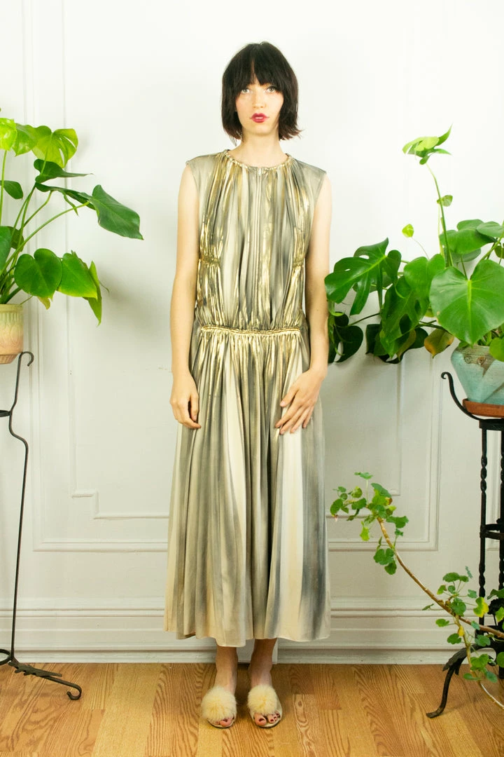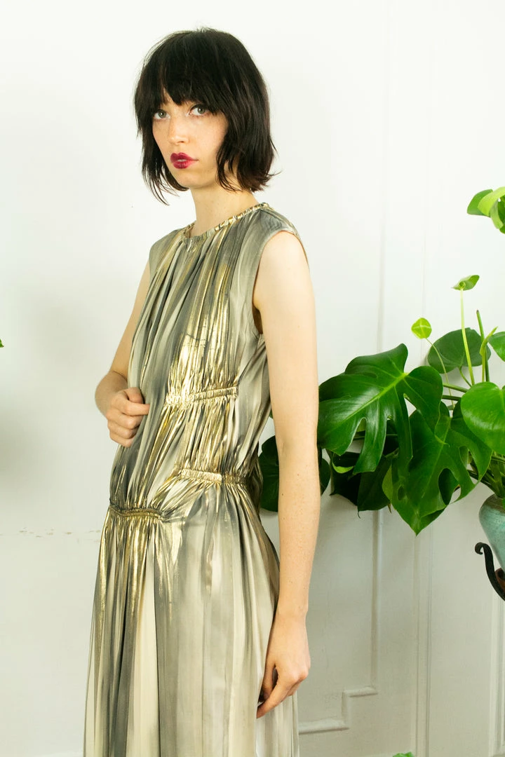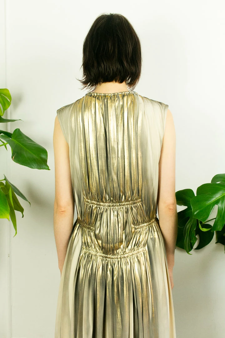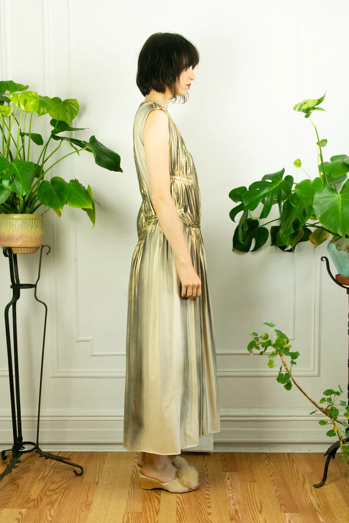 Heavy weight stretch fabric treated with metallic gold foil and spray dyed to emphasize pleats