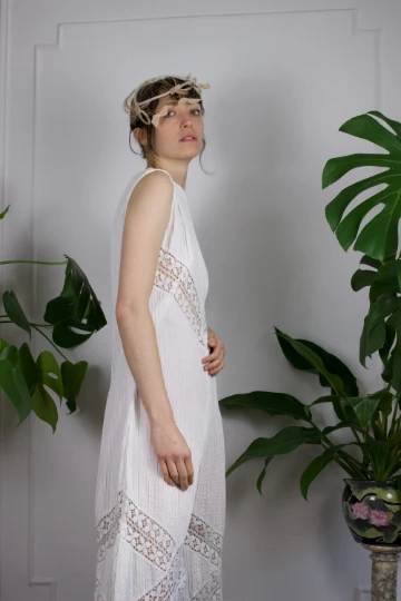Crisp white cotton, pin tucked with crochet lace piecing throughout.