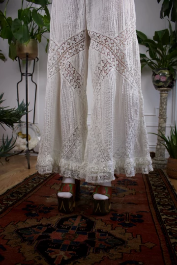 Wide Leg pants with crisscrossing lace details that end in a flare with a lacey hem ruffle.